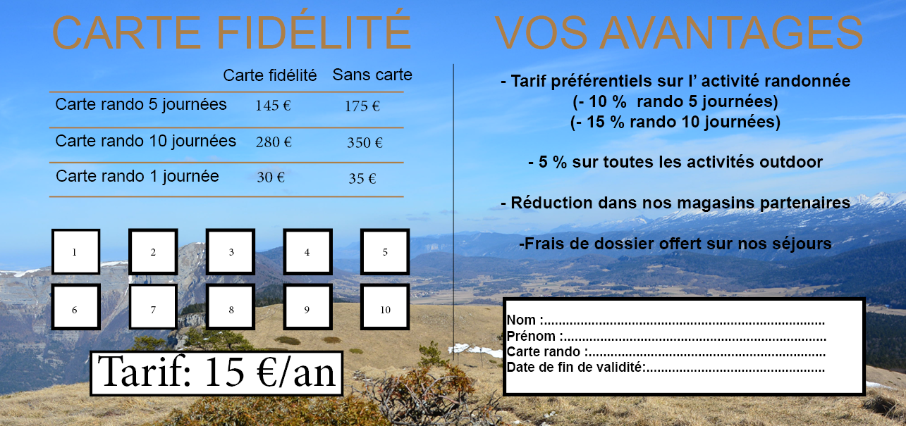 Chaque mois, nous vous proposons 3 randonnées différentes sur les massifs du Vercors, de la Chartreuse, du Diois et de l'Ardèche en semaine ou le week-end. Vous avez un accès privilégier à toutes les activités que propose Alpicrando à tarif préférentiel avec notre carte de fidélité.